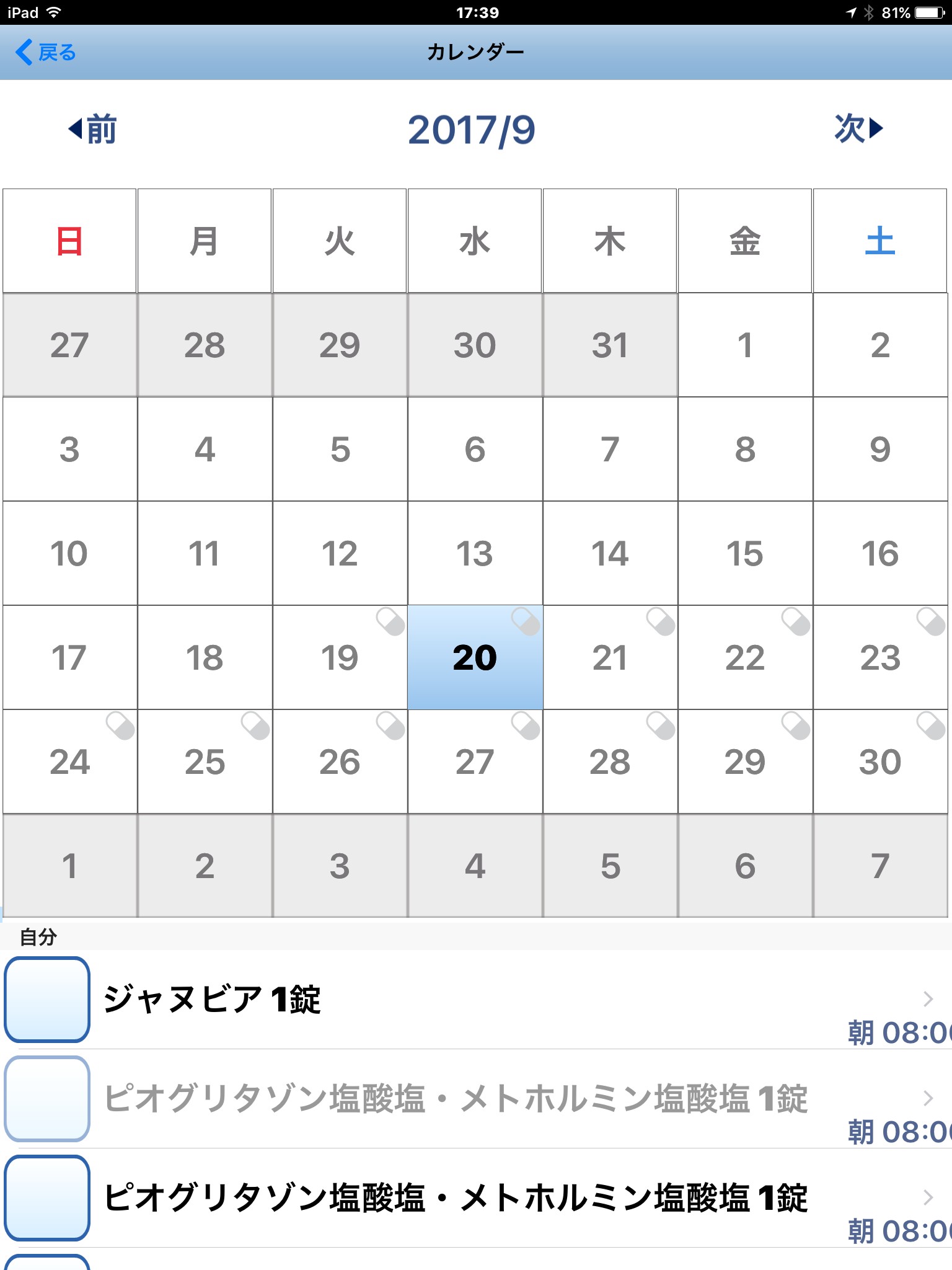 薬のデータの入力が終われば、アプリの使用が始まりますが、なんといっても、薬の服用を忘れずに管理することが最大の課題になります。カレンダーから服用のタイミング、履歴が管理できます。