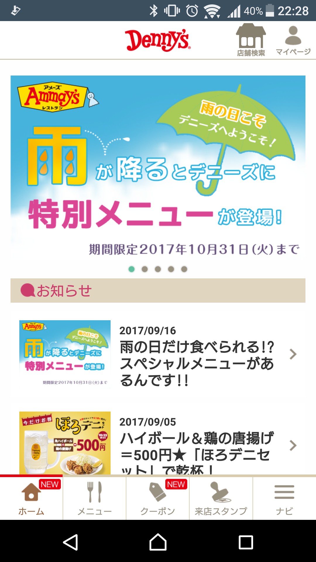 デニーズのアプリを開くと、トップページにはデニーズの最新情報やお知らせが掲載されています。
