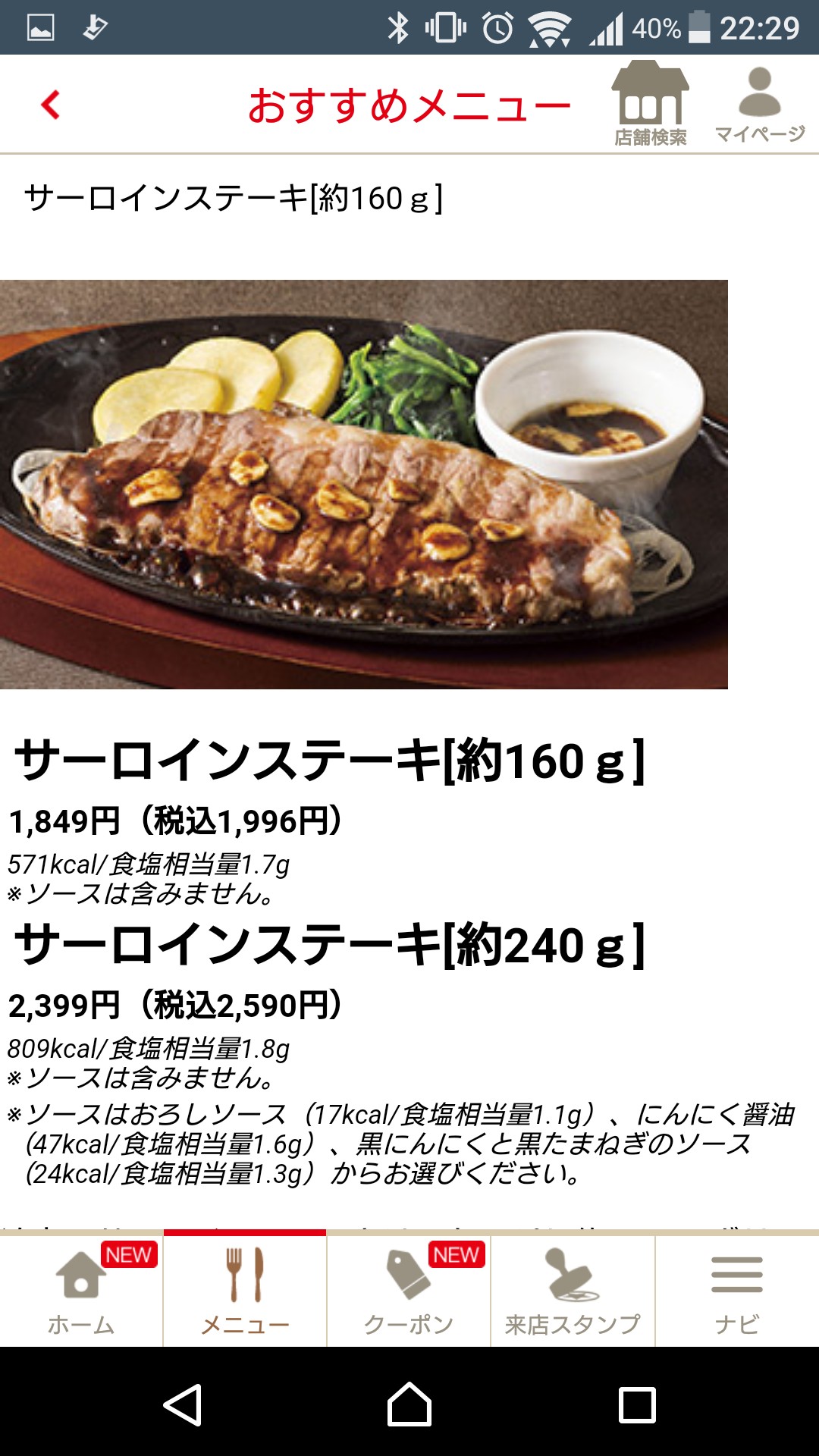 カロリーや食塩相当量などが見られるほか、そのメニューにクーポンがあるときはメニューページから飛べるようにもなっています。