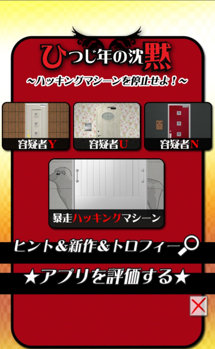 もしインターネットが攻撃されたら、世界は、沈黙するのかも知れない…そんな言葉から始まるこのアプリ。主人公である脱出探偵に1本の依頼電話が掛かってきます。インターネットを完全停止させる目的で行われたサイバーテロの容疑者は捕まえたものの、ハッキングマシーンが暴走していて止められない!そんなハッキングマシーン「メリー3号」の暴走を止めるため、謎解きが開始されます。容疑者の部屋を行き来し手がかりを集め、マシーンの停止コードを打ち込んだとき、エンディングで明かされるサイバーテロ事件の真相…考えさせられるような展開にハッとさせられます。是非、自分の目で確かめてみてください。