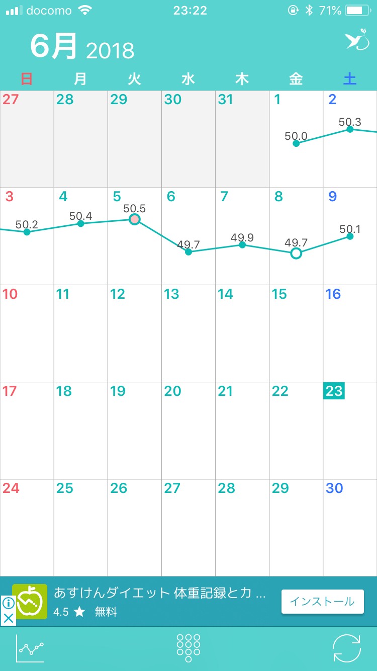記録した体重を確認するためにグラフ画面を開く必要がなく、カレンダー上で毎日の体重変化が表示されます。