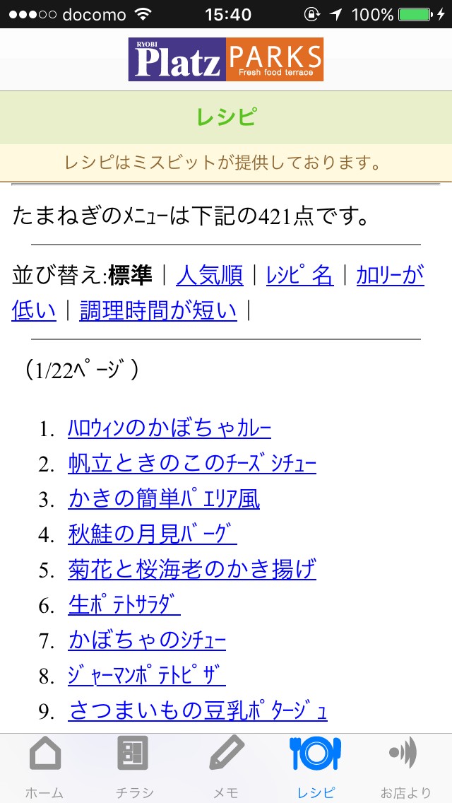 My 店舗は3つまで登録できます。登録した店舗のチラシはそれぞれすぐに確認できるようになるので、よく使う店舗はぜひ登録しておきましょう。通信環境が悪い時も、直前に見たチラシはオフラインでも見ることが出来て便利です。お買い物する前にチラシを見て確認するのにもいいですが、お買い物をしている最中にも使うことが出来ます。チラシ一覧から店舗詳細も確認できます。電話番号や住所、営業時間などが掲載されています。地図を押すとグーグルマップを開いてすぐに場所を確認することも出来ます。レシピ検索ではキーワードを入力するとたくさんの候補が出てきました。それらを人気順やカロリーの低さ、調理時間の短さなどで並び替えることが出来るのがおもしろいです。写真付きでレシピを紹介してくれる他、店頭で配布していたPOPも確認できます。