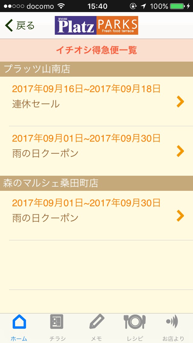 チラシは現在地から近くの店舗を検索してくれるので、お店に迷ったらこの機能も便利です。今日のチラシを確認してみると、実際に配られているようなチラシを見ることが出来ました。自由にズームしたりスライドさせることが出来るので、文字が見えないということはありません。チラシで気になったものがあれば右上からメモに移り、保存することも出来るのでお得な情報を逃しません。メモにはそのチラシの店舗も表示されるので後から見ても分かりやすいです。「イチオシ特急便」からクーポンなどの情報も調べましょう。私が調べた店舗では雨の日に来店するとお得になるクーポンが掲載されていました。時期やその店舗にとって情報は変わるので、お買物前にチェックしておきましょう。