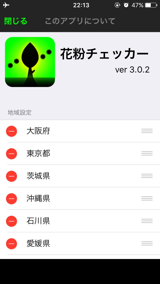 そして、「花粉チェッカー」アプリは最大9か所まで地域を自由に設定したり変更したりすることが可能です。