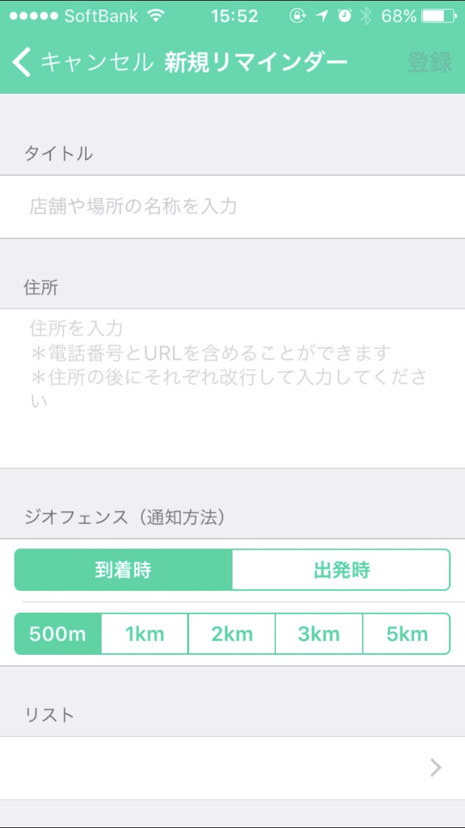 現在地の地図を出して、地図から行きたいお店や場所を登録できます。地図の場合は、この辺りに来たら、リマインドしてほしいという大雑把な設定も可能です。正確なお店の場所や検索しても出てこない時、住所検索で登録もできます。買わなければいけないものをいつものお店の側まで来たら、リマインドしてほしい時にもこのアプリは便利です。生活用品をメモしてお買い物に行かなければいけないのに、いつも通り過ぎて家に帰って思い出すこと、私は多々あります…。そういう時、あの店の近くを通った時に、リマインダー機能がお知らせしてくれるので、忘れずに寄ることができるのです!到着時にも通知設定できますが、その場所を離れるときにリマインドする設定もできます。