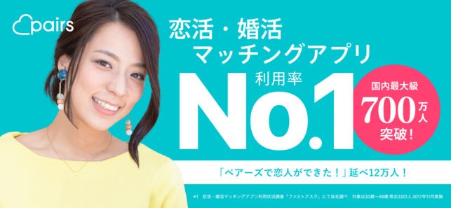 画像出典:https://itunes.apple.com/jp/app/pairs-%E3%83%9A%E3%82%A2%E3%83%BC%E3%82%BA-%E6%81%8B%E6%B4%BB-%E5%A9%9A%E6%B4%BB%E3%83%9E%E3%83%83%E3%83%81%E3%83%B3%E3%82%B0%E3%82%A2%E3%83%97%E3%83%AA/id583376064