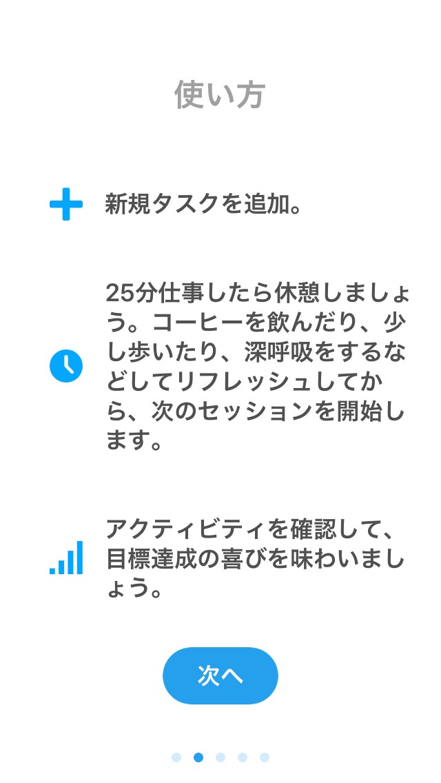 デフォルトでタイマーの設定時間が25分、休憩時間が5分に設定されています(自分で変更も可能です)。