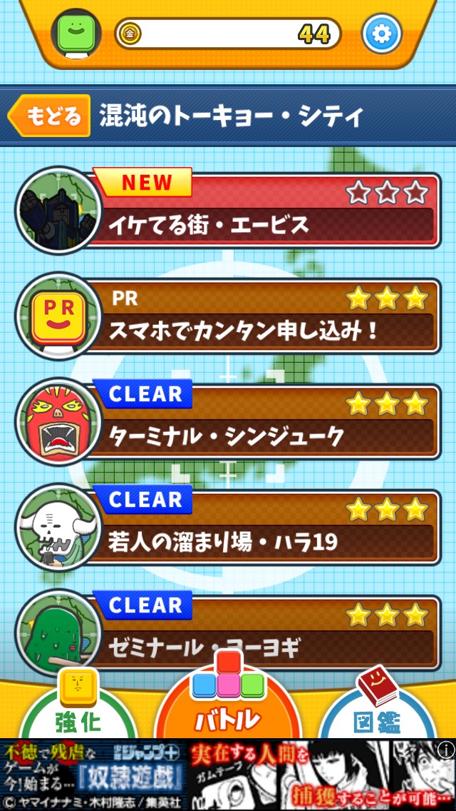 基本のメニューは大きく分けて、強化、バトル、図鑑の3つに分けられます。それぞれの項目についてご紹介します。