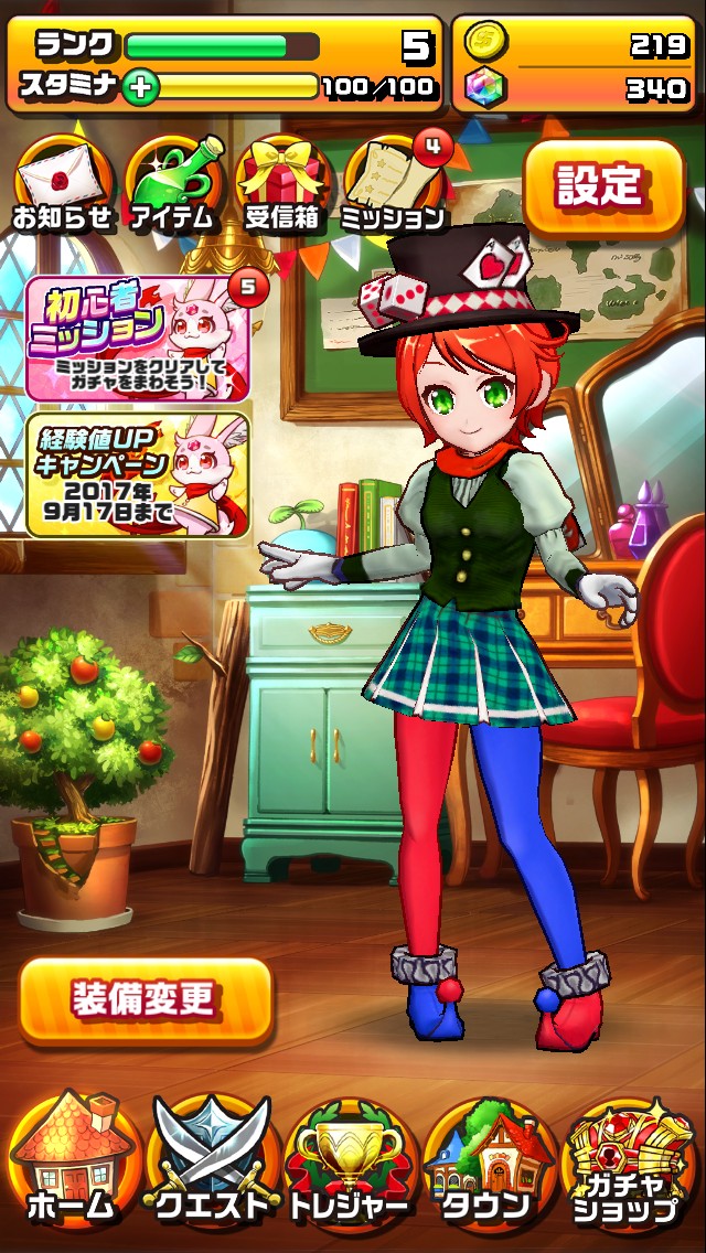 ホーム画面では運営からのお知らせや手持ちのアイテム、ミッションなどを確認できるほか、現在行われているキャンペーンなどを確認できます。装備の変更もこちらのホーム画面から行えます。