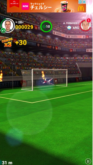 ゴールの四隅や上部ギリギリを狙うと得点が加算される他、指定されたエリアにゴールを決めて高得点を狙うモードもあります。観客も声援を送ってくれるので、サッカー選手気分でフリーキックを楽しめることでしょう。