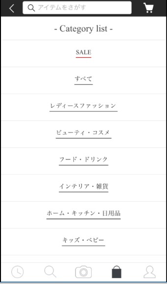 商品カテゴリーから購入する場合はアプリを立ち上げたあと、画面下右から2番目のバッグのボタンをクリックします。