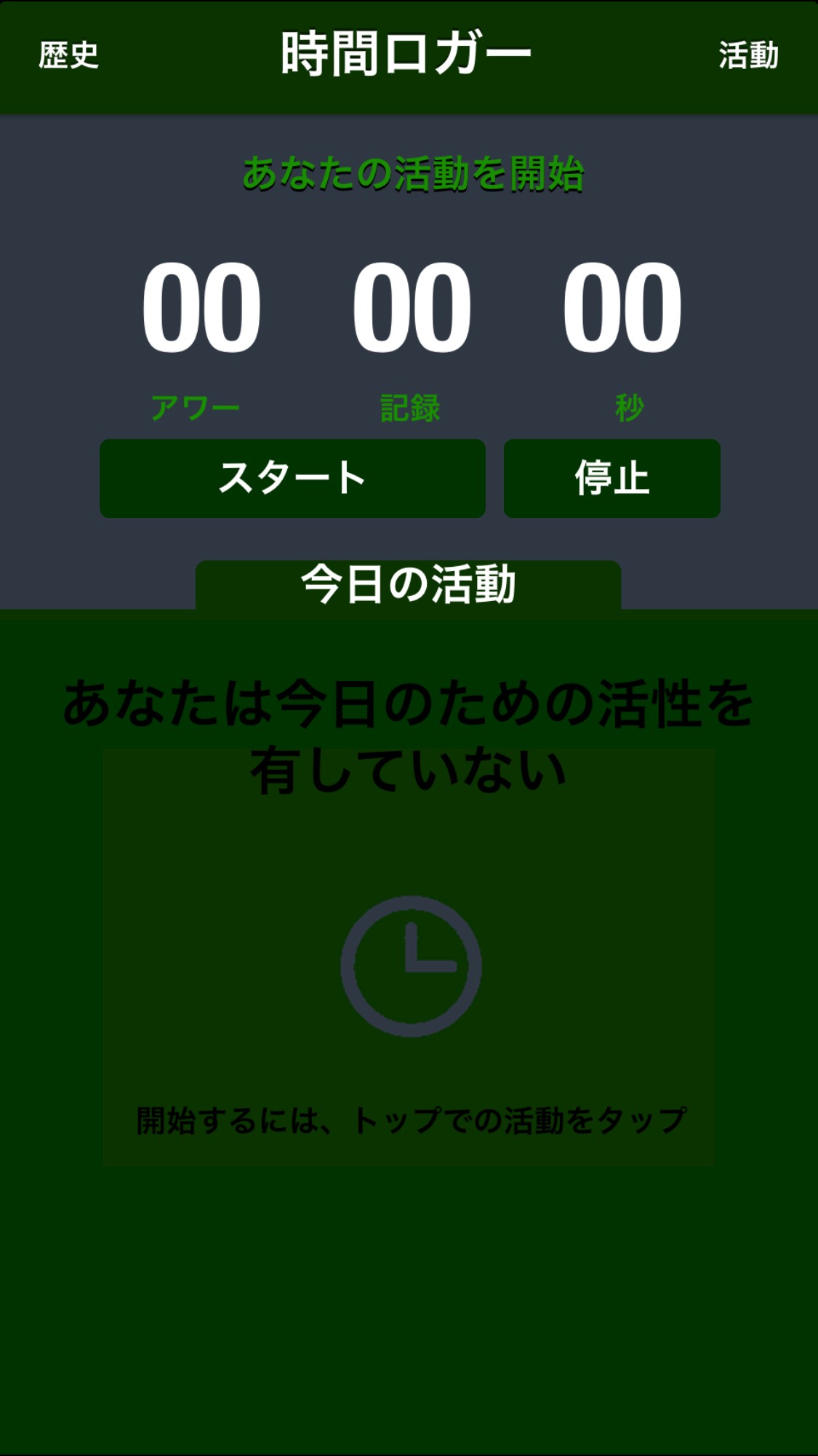 ホーム画面に「歴史」というボタンがありますが、これは活動記録を表示してくれる画面です。ここをタップすると登録した活動記録が表示されます。