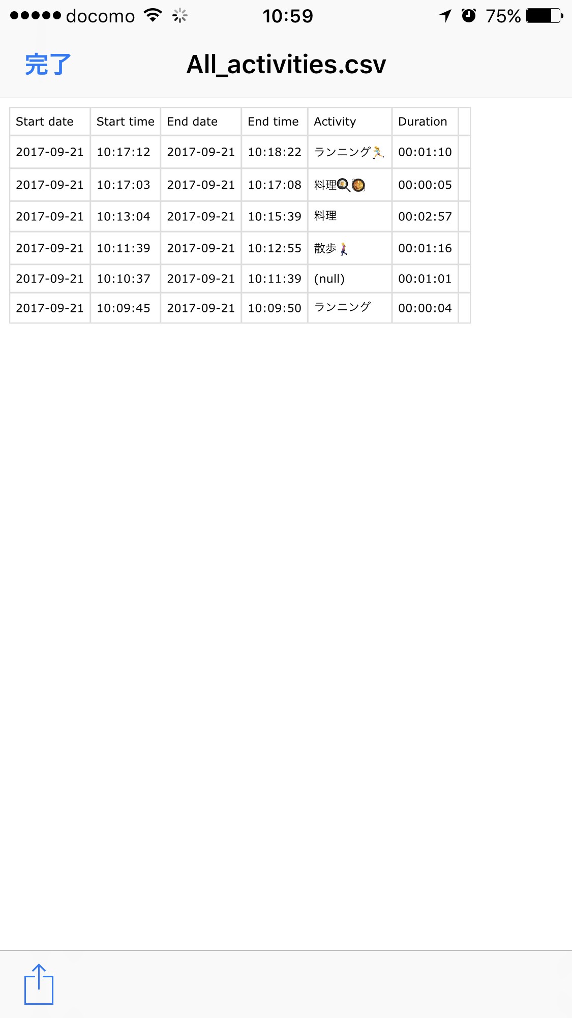 「歴史」ボタンをタップすると、画面右下に「輸出」ボタンがあります。これはエクスポートボタンになります。つまり、活動記録をメールに送ることができるようになっているんです。「日にち」「始まり・終わりの時間」「活動内容」「活動時間」を一覧表で表示してくれます。量が多くなってしまったらアプリ内での確認はしづらくなることも。エクスポートしておけば後からの確認も楽ですし、一覧表なのでわかりやすいです。印刷したい時にも楽ですね。 ※リセットボタン(明確な)を押すとすべてクリアになり今までの記録の確認はできません。残したい記録はエクスポートしておくことをおすすめします。