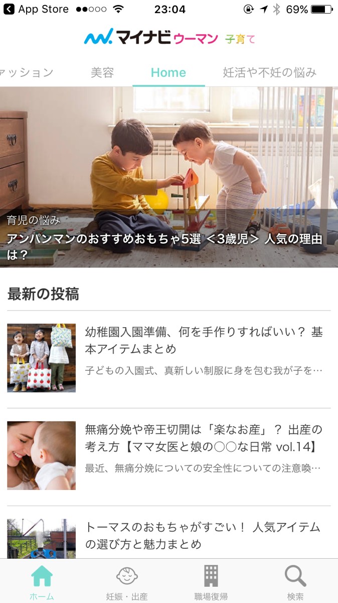「マイナビウーマン子育て」は、株式会社マイナビが運営しているアプリです。妊娠中から育児中、仕事復帰を考えているママにおすすめ!アプリに記載されている情報は、全て医師や専門家監修の内容なので信頼性があり、安心して読むことができます。アプリならではの特徴は、妊娠中のママにはお腹の中にいる子どもの様子がイラストとメッセージが、子育て中のママには0歳から1歳までの間限定で赤ちゃんの様子や癒しのメッセージが毎日届くサービスです。