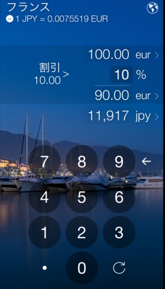 このアプリでは日本円でいくらかということに加え、割引額、チップの計算もできます。