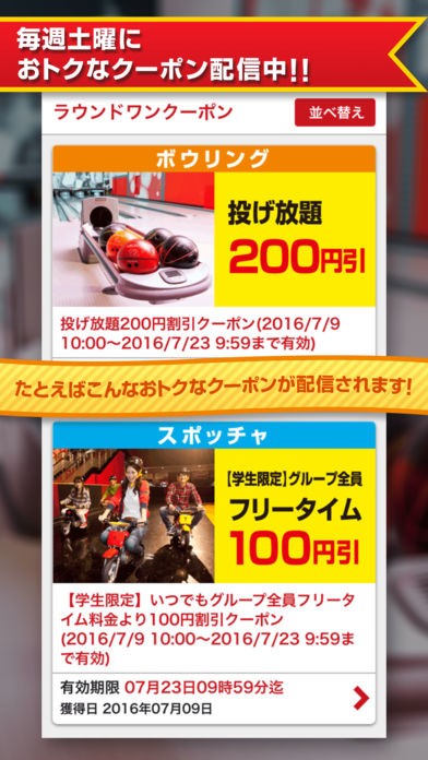 このアプリではラウンドワンで使える様々なクーポンを配布しています。