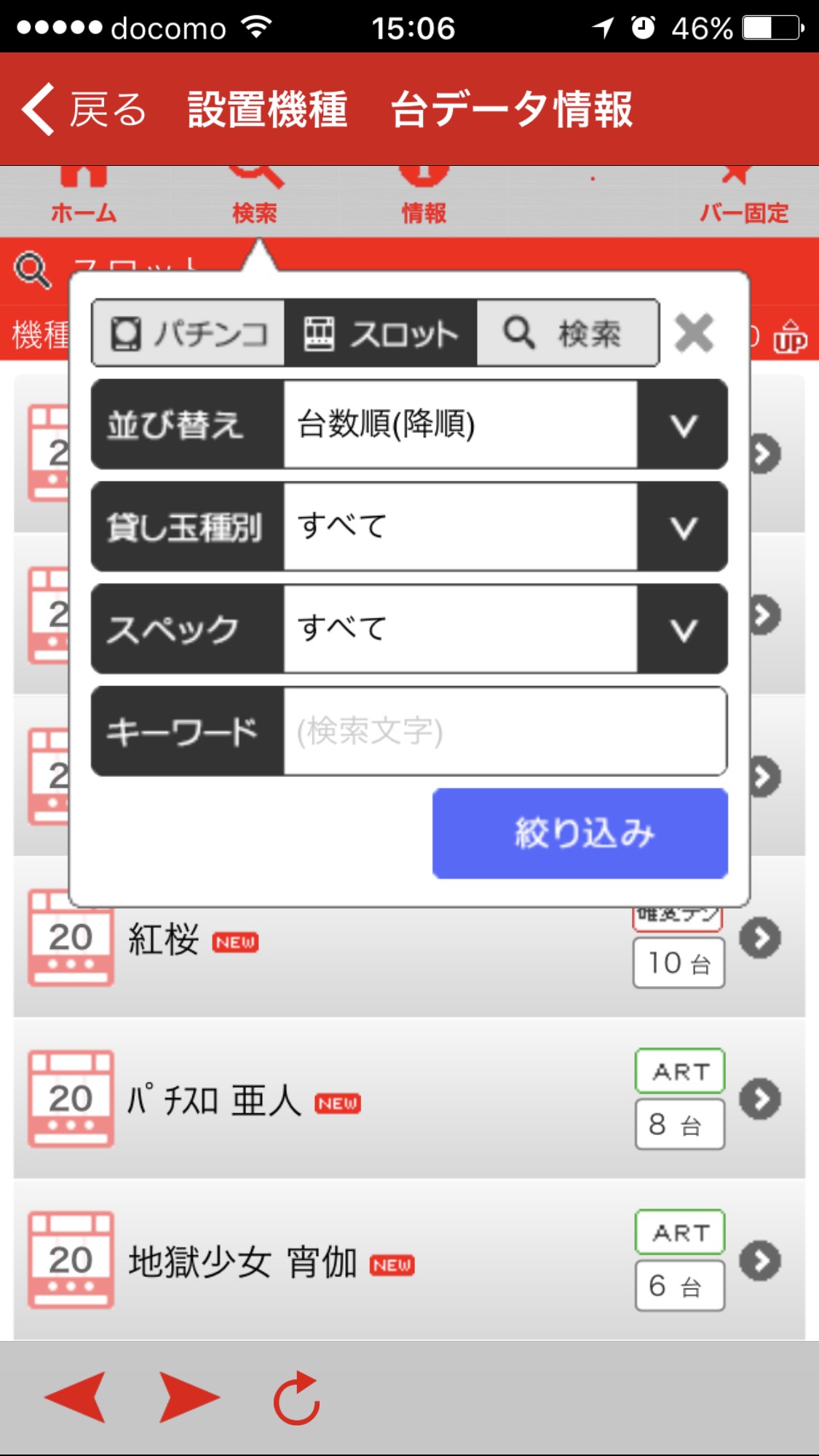 機種リストが表示されています。機種をタップすると、台番号、獲得数、大当、確変などの情報が見れます。検索機能もついているので、調べたい台も簡単に調べることができますね。こちらもパチンコ、スロットどちらも調べることができます。