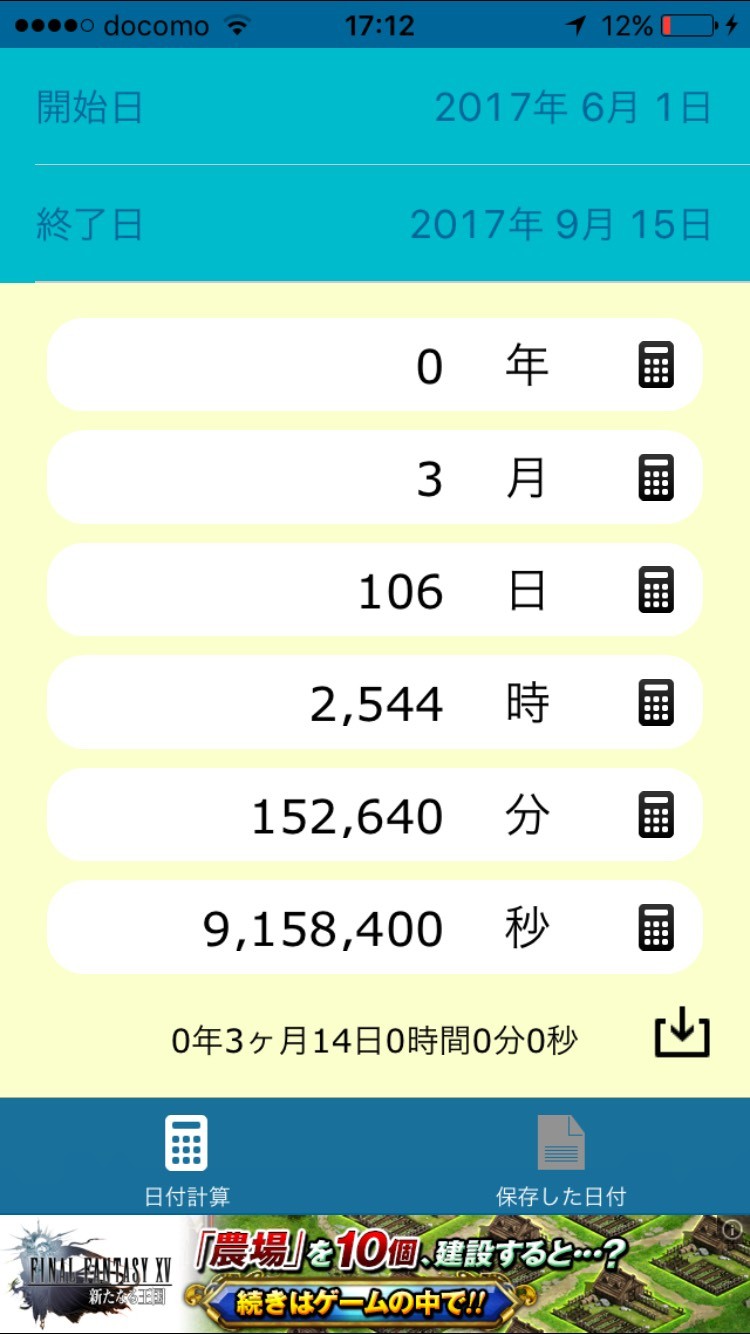 アプリを開いて、自分の知りたい日の開始日と終了日を入力します。そうすると、様々な単位でどれくらいの日時が経過しているかを教えてくれます。