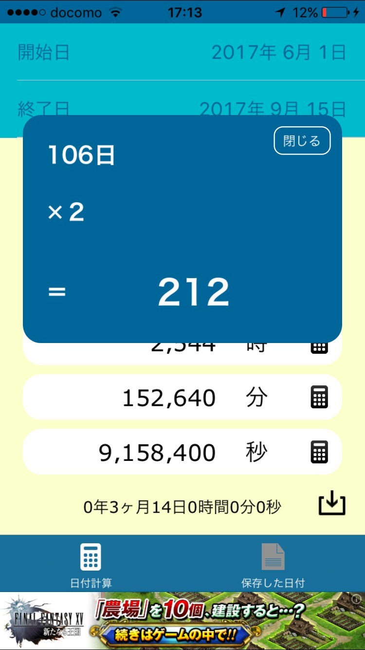 このアプリのポイントは、何日経ったかが分かる他に電卓が付いているところです。