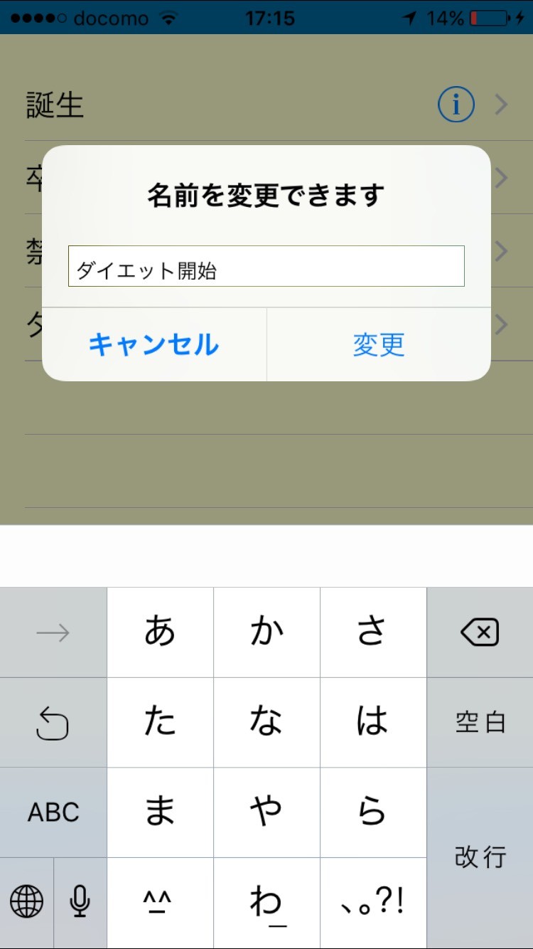 「あのひから」に保存した項目は一覧で見ることが出来ますが、登録名を変更したいという場合は、保存した日付のセルを長押しすると登録名の変更ができて便利です。