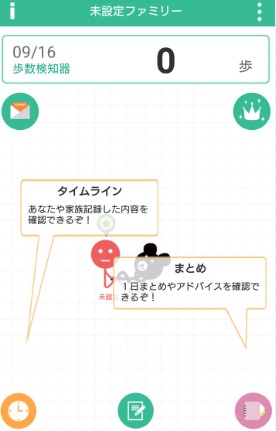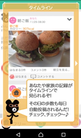 [タイムライン]には、グループの家族・仲間・友達のコメントや通知と共に、マスコットキャラクター"てくてくくん"のメッセージが表示されます。