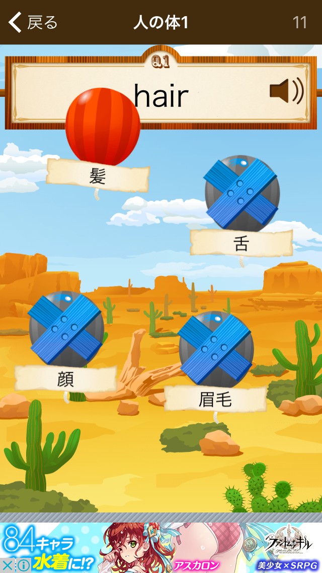 画面上部に英単語が表示され、音声が流れるので正しいと思う日本語をタップします。