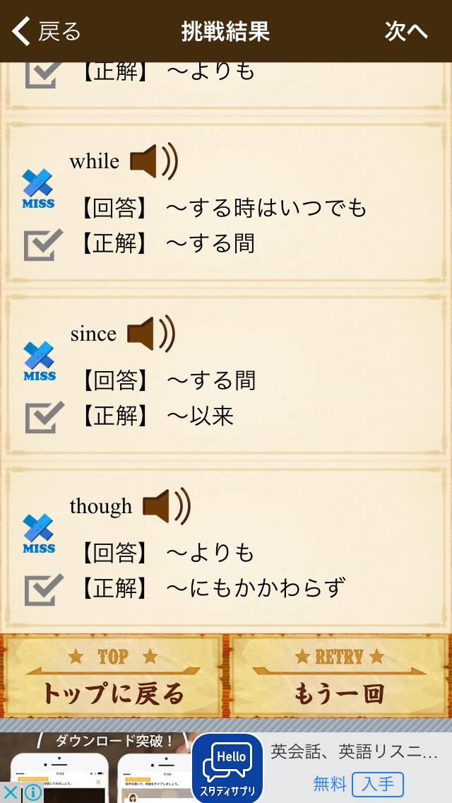 その際間違った回答も表示されるので、気になる単語はあえて間違えるという手もありますね。