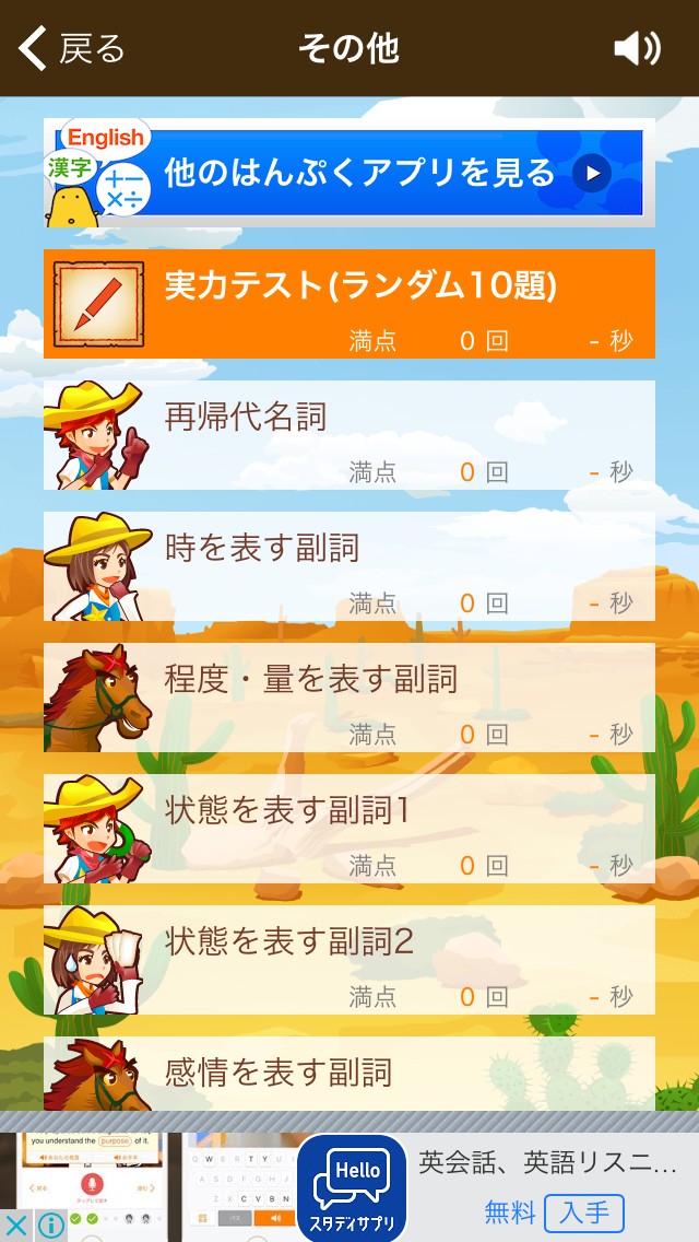 実力テストは名詞、動詞などの項目ごとにランダムで10問出題されます。