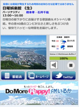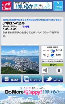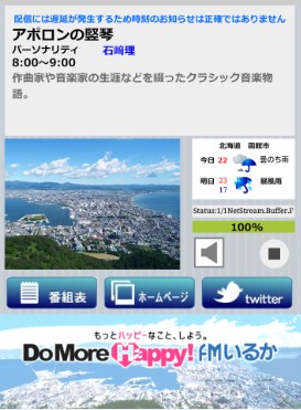 ホーム画面には函館の風景や天気情報と共に、放送中のラジオ番組の説明が表示されています。