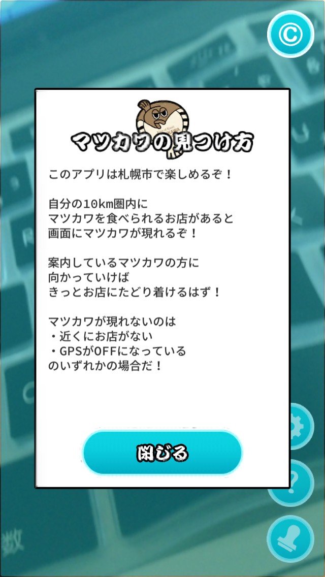 「マツカワを追え!」ではGPS機能を利用して、10km圏内にマツカワを提供しているお店があると、マツカワが出現し、お店まで案内してくれるような内容となっています。