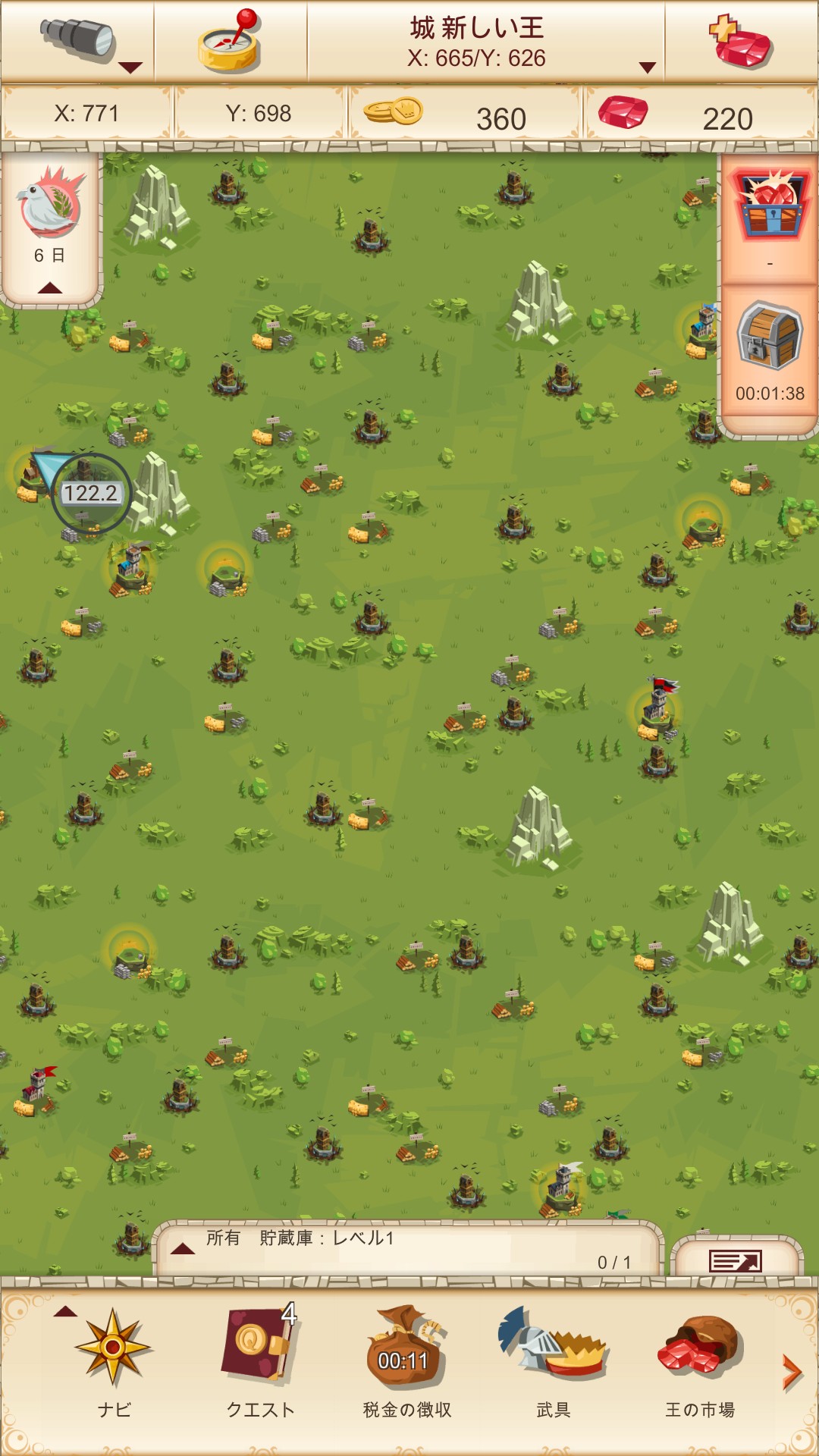 メニューのナビから「世界地図へ移動」を押すと城外のマップを確認することができ、他プレイヤーのお城が多く建てられている様が見られます。
