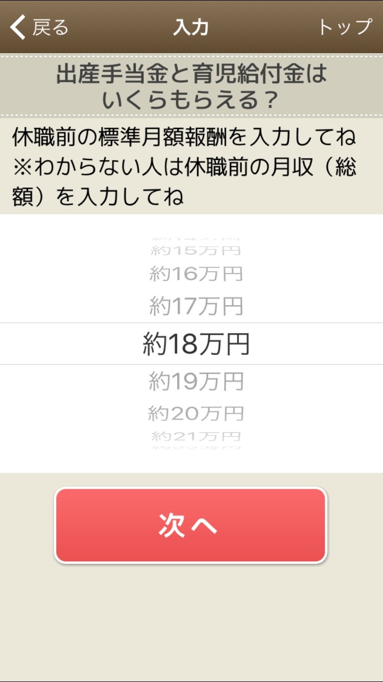 出産手当金と育児給付金の項目をタップしてみましょう。産休、育休中の手当についてわからないときはここで休職前の月収を選択します。