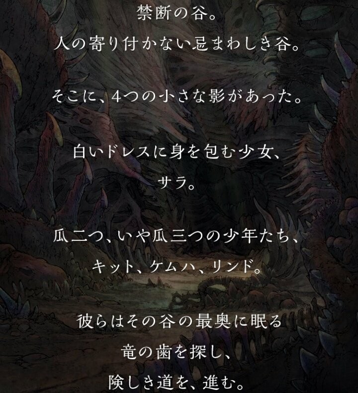 白いドレスを身にまとう少女「サラ」と、瓜三つの少年たち「キット」「ケムハ」「リンド」が谷の最奥眠る「竜の歯」探し険しき道を進む。