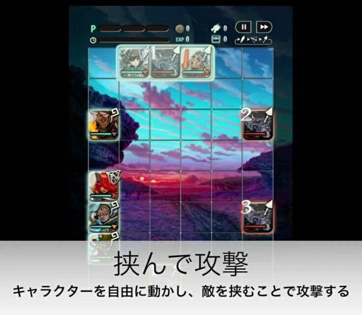 わかりやすく言うと「挟み将棋」のようなシステムで、キャラクターを操り時間内に敵を挟めば攻撃できます。