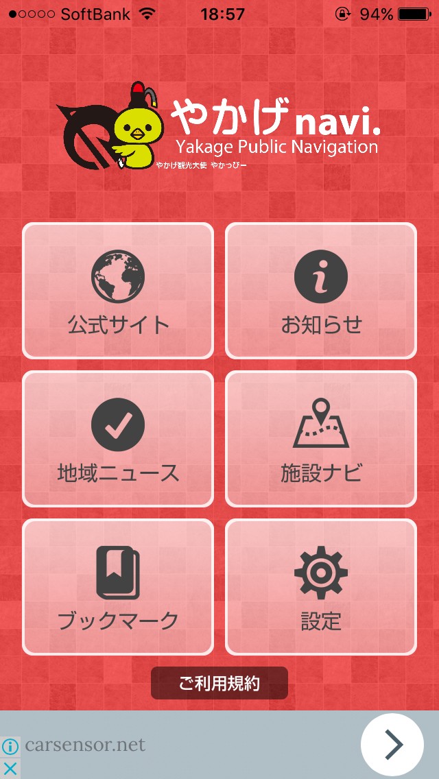「やかげnavi.」は、矢掛町からの最新情報(気象情報や災害緊急情報など)のプッシュ通知、観光・イベント情報の配信、公式ホームページの閲覧、その他の生活に役立つサイトへのリンク集といった機能が搭載されています。矢掛町の暮らしにおいて知りたいことがこのアプリ一本に集約されているものと考えてよいでしょう。アプリを起動すると、スッキリとしたトップページと、矢掛町のゆるキャラ「やかっぴー」がお出迎え。とってもかわいいのです。