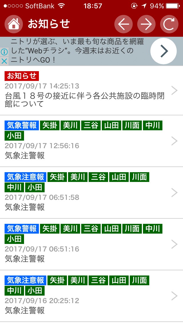 - 「お知らせ」で気象情報や防災・防犯の情報をチェック。プッシュ通知も