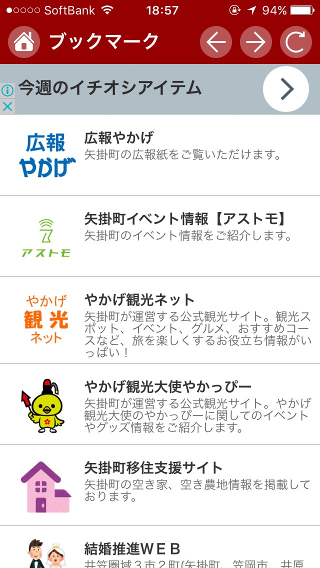 「やかげnavi.」には「ブックマーク」という機能もあり、子育て・教育情報がわかるサイトや、矢掛町のFacebookのページなどへのリンク集も確認できます。矢掛町の住むみなさん、ぜひ「やかげnavi.」をおすすめします。また、イベント情報や公共施設や観光施設の情報もわかるので、矢掛町を訪れた観光客にとっても重宝できるアプリと言ってよいでしょう。