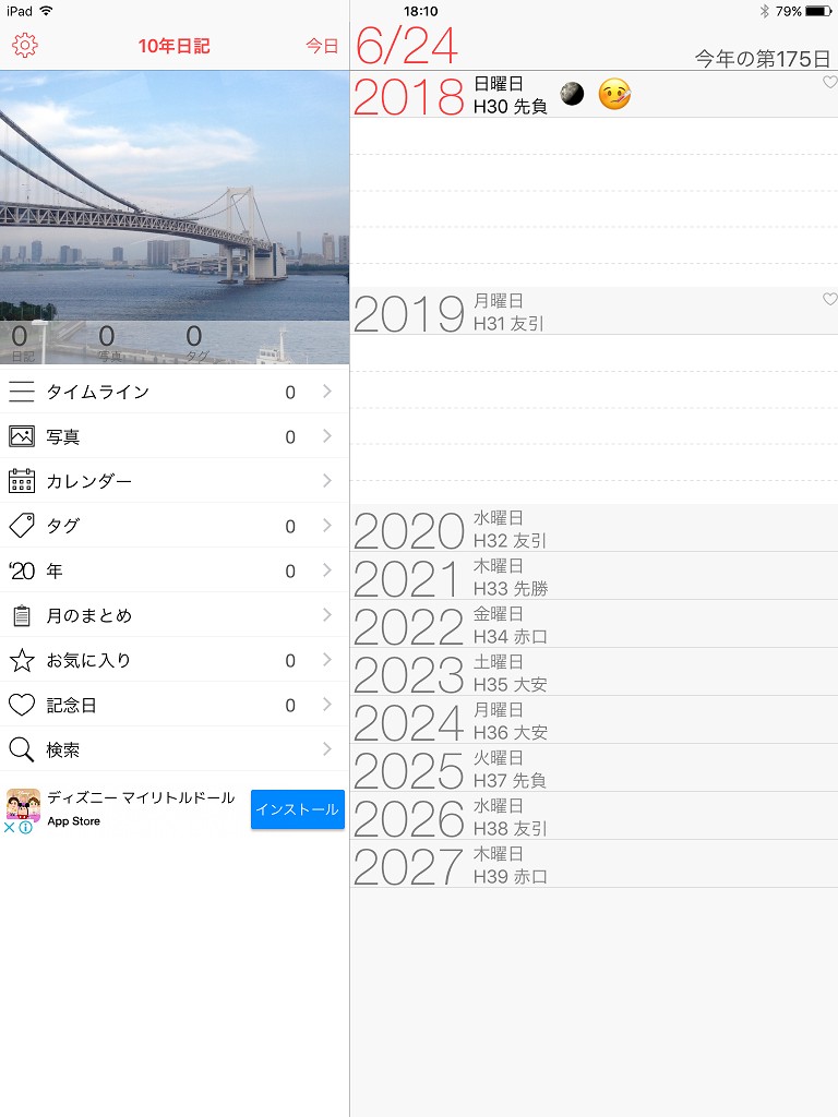10年先までの日記をつけることが可能なアプリです。長期間日記をつけたいと考えている人におすすめで、2年目以降の日記は1年目の同じ日に書いた内容が表示されるので、どんなことがあったのか思い返しながら書くことができます。使い方は起動して画面右側にある日記欄の書きたい日をタップするだけです。入力に移るので自由に文字を打ち込みましょう。写真は何枚でも貼り付けることができますし、パスコードロック機能もあるのでセキュリティ面も安心です。