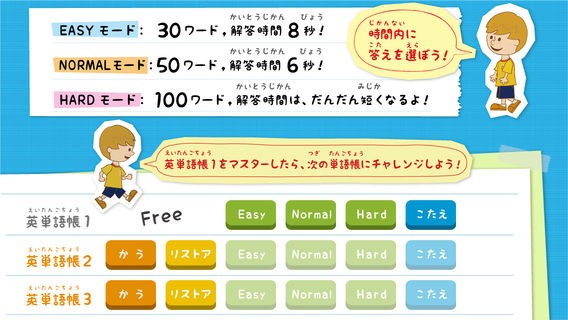 もらった「グレードメダル」はお子様の次ぎの回への励みにして下さい。今時は「ゲーム」ならば馴染み易いのは子ども世代に共通といえると思います。きっと子ども達は楽しく、ゲーム感覚で遊んで学んでくれることでしょう。さらに単語帳購入機能を用いてもっと語彙を増やせばさらに単語の暗記に。「無料の内容」で単語帳が100語で構成されているので追加として新しく単語語彙数を増やす場合は