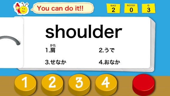 「英単語キッズ」アプリのゲームの流れは、シンプルでとっても簡単!まずは最初に3つのモードからお子様の上達に応じて選びます。「EAZYモード:30語 解答時間は8秒間」→やさしいレベルなのでまずはこちらから始めるといいと思います。「NORMALモード:50語 解答時間は6秒間」→やや慣れてきたらこちらのモードを選んでみましょう。「HARDモード:100語 解答時間は徐々に短くなります、慌てず落ち着いてトライ」→かなり慣れたらこちらもやってみましょう。という具合に3段階にわかれているのでスタートの前に選んで下さい。スタートすると、ボタンの1~4までの中から正解の答えと思うものをタップ、右端の赤ボタンを押すと決定!さて答えは?