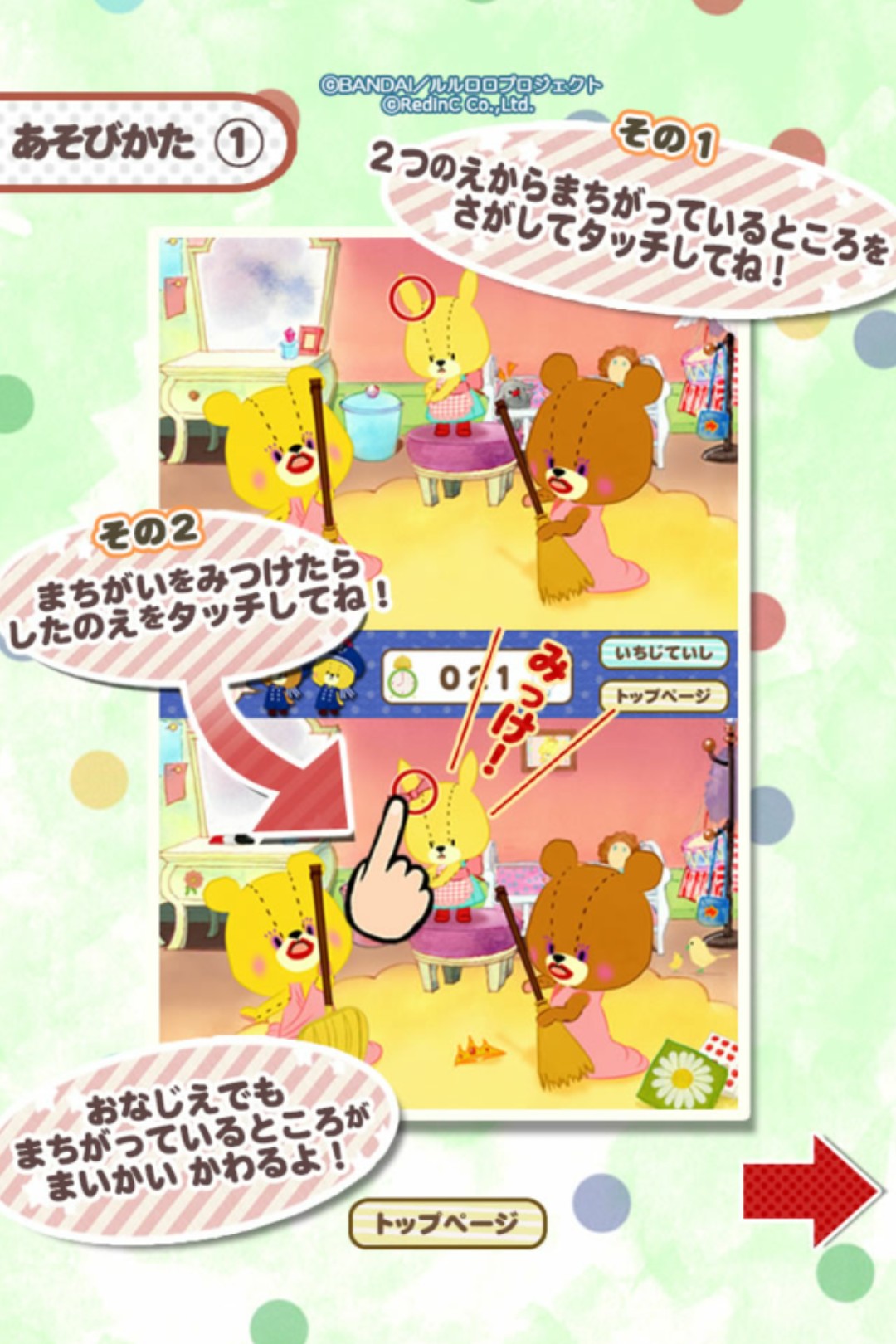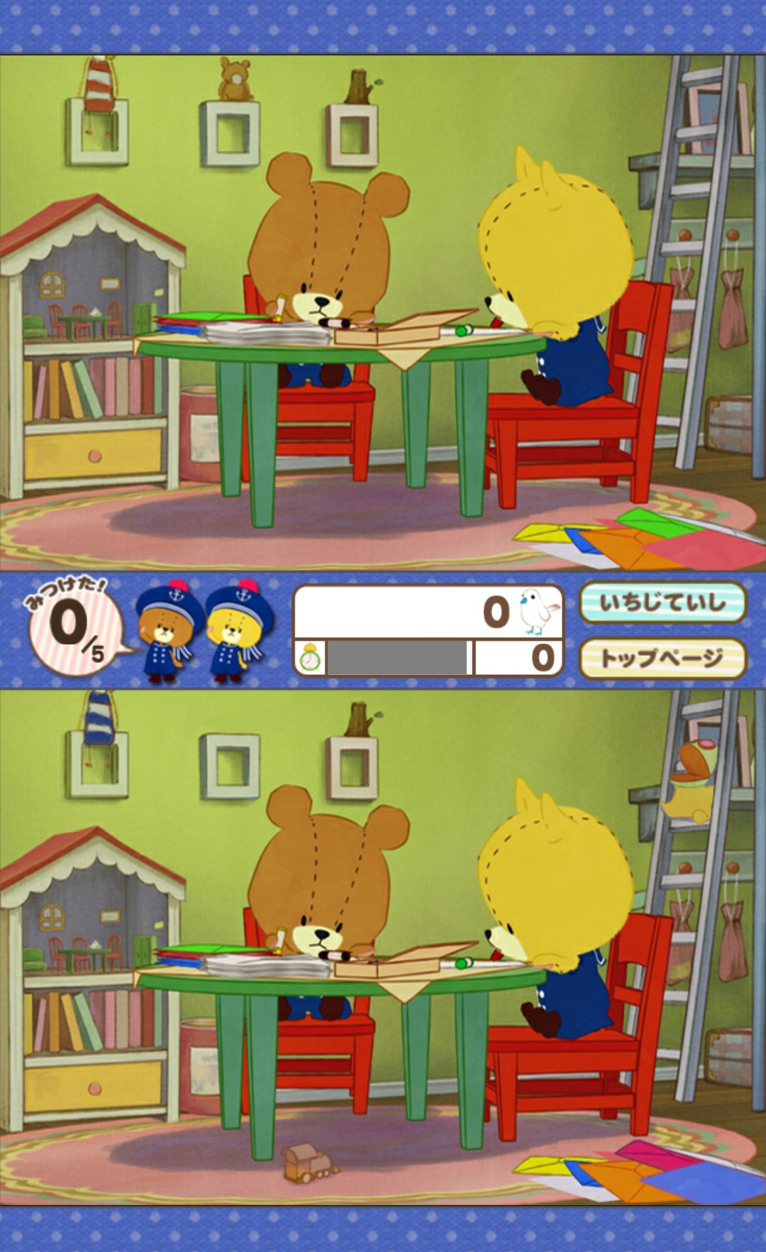 遊び方は、とても簡単♪上下に出てくる2つの絵を見比べて、間違っている場所を探しタッチするだけです。間違いを全て見つけ終わるまでの時間を競えるステージモードと、制限時間内に連続して間違いを見つける事でスコアを競うスコアモードの2つから遊び方を選べます。