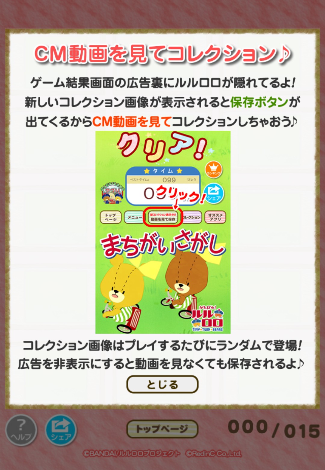 各モードや難易度で間違い探しを楽しむ、がんばれ!ルルロロ。各ステージをクリアすると、赤文字で「新コレクションを展示中!」と表記される事があります。そこを開くと他アプリの動画に移行され、見終わった後はコレクションに画像が追加されるのです。コレクションは全部で15種類。ステージクリアすると必ずもらえるものではないので、新コレクションが追加されたらぜひ覗いてみてくださいね♪ちょっとしたコンプリート要素も楽しめますよ。