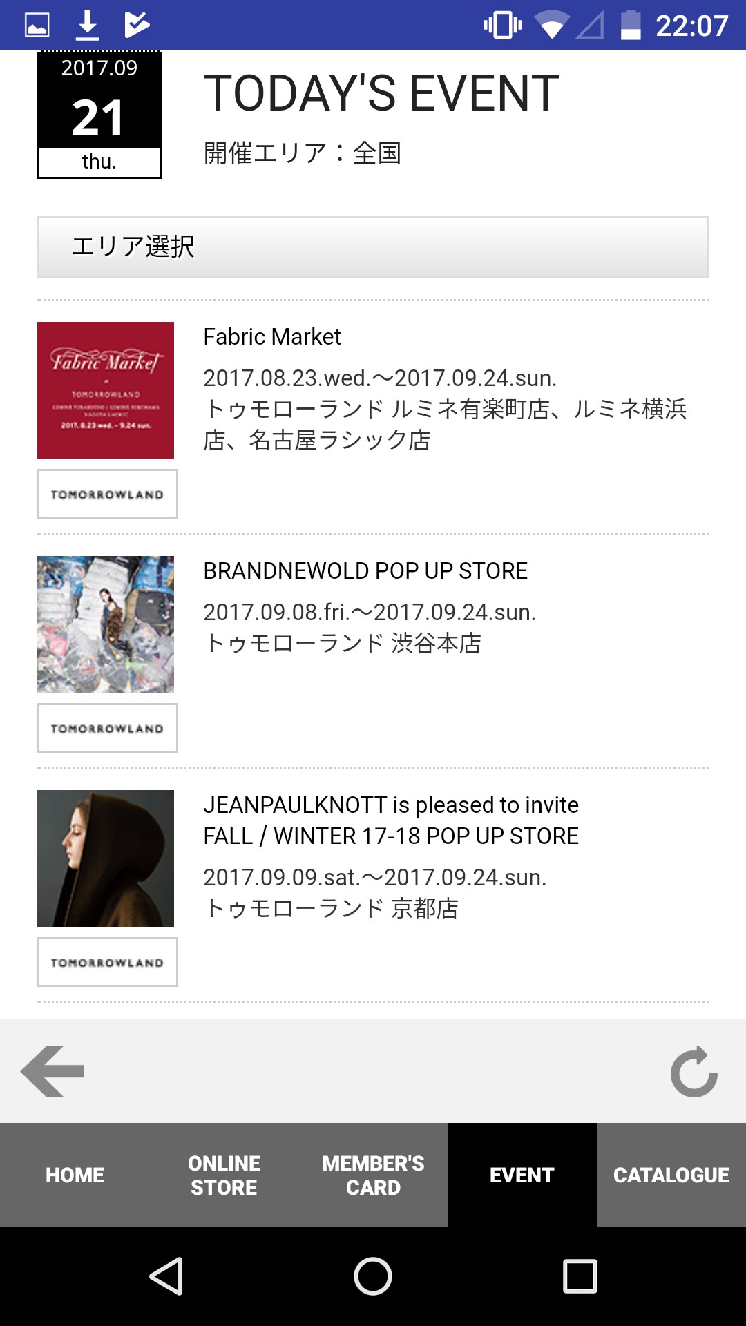 全国のトゥモローランド店舗でのイベント情報も見ることが出来ます。エリアや月日での検索も出来ますので、実際に足を運べる店舗での、行くことが出来る日の検索が出来ます。