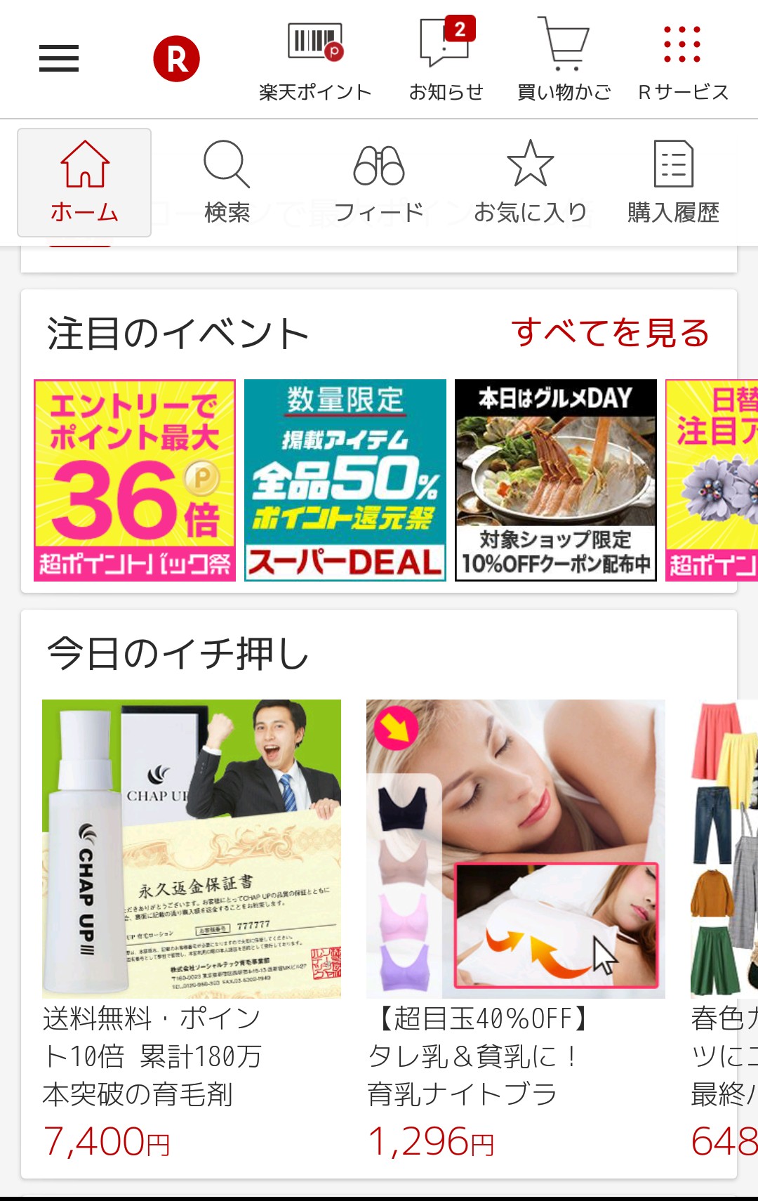 商品をサクサクと見れる「楽天市場」では、気になる商品をお気に入りに登録することでトップ画面から直ぐに商品ページを開けるようになります。コンテンツの1つであるフィードページからは、購入したユーザーによる商品へのコメントも閲覧できるので、SNS情報を得ながらショッピングを楽しめます。