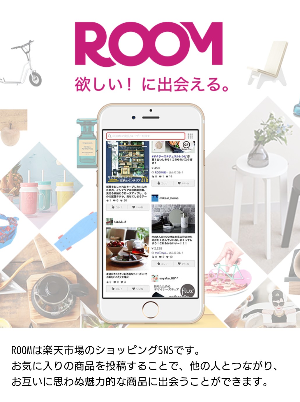 「楽天市場」とリンクしているSNS「ROOM」の情報をこのアプリからも見れるので、気になった情報をチェックしておけば欲しくなった時にさっと購入できます。