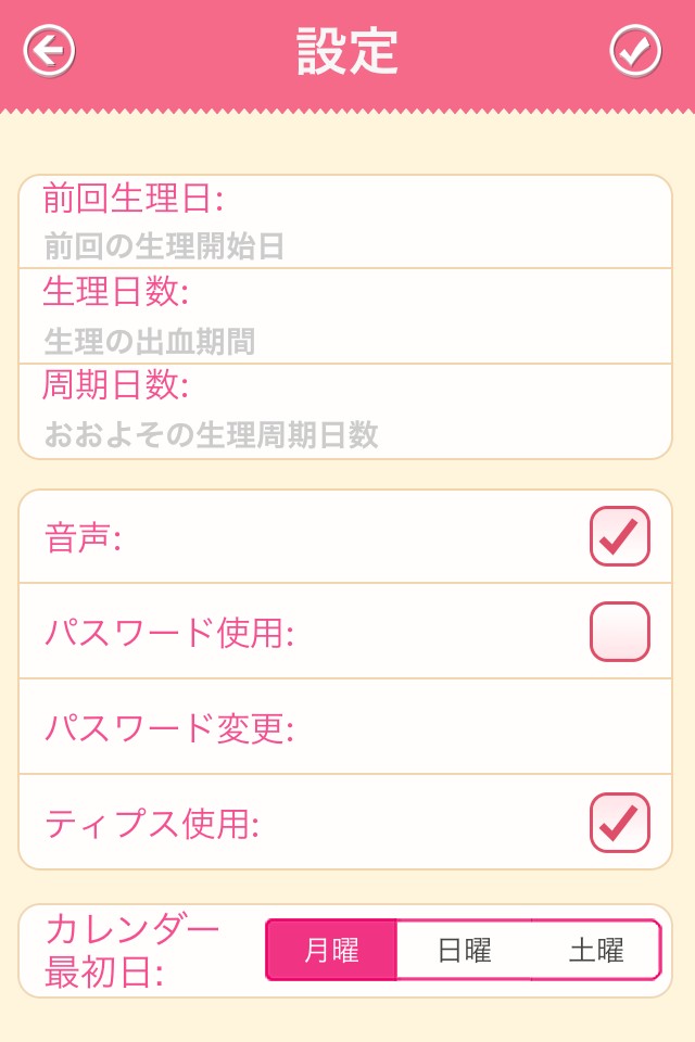 前回の生理開始日と出血の日数、そしてだいたいの生理周期を登録するだけで、アプリが生理予定日を割り出してくれます。いちいち自分で計算を行う必要がないので、とりあえずアプリに入力しておけばいざというときに役立つデータとなるでしょう。