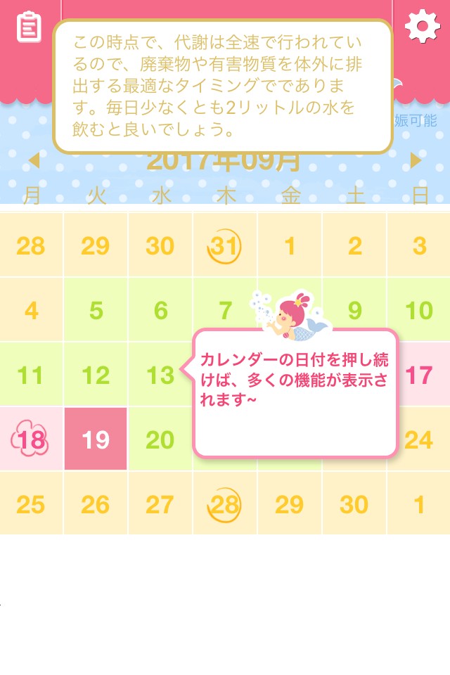 カラフルでかわいらしいカレンダーなので、ふつうの予定を書き込むメインとしても利用できます。日記や簡単なメモを残すことが可能なため、体について気になることがあったときは積極的にカレンダーへの書き込みを行いましょう。あらかじめカレンダーに生理周期が載っているおかげで、他の予定が立てやすくなりますね。