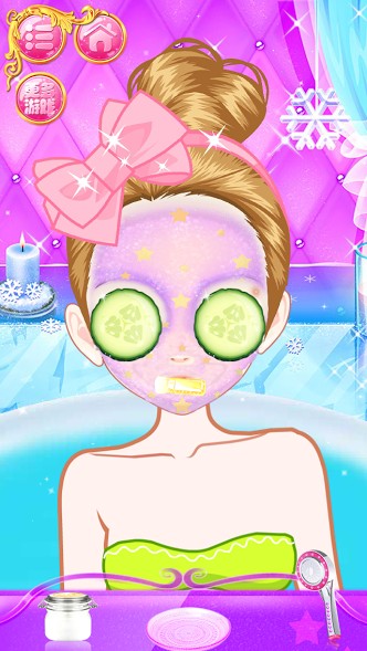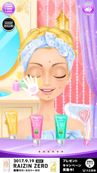 おとぎ話の世界のアプリでは、メイク以外にも、顔のメイクに必要な化粧水やキュウリのパックができます。
