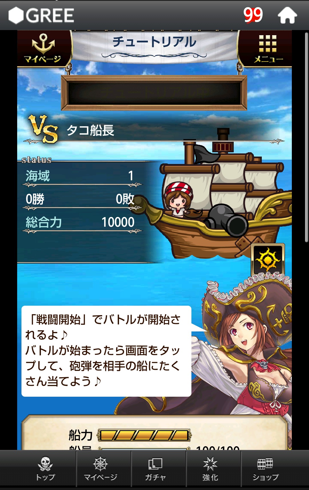 海賊といえば船!海戦へ出発する為の準備を始めましょう。初めて海に出発する時は、チュートリアルも兼ねたミッションが登場するので指示通りにタップして流れをつかみましょう。百年海戦では、手に入れた船のパーツを設定して海戦に出発しレベルを上げていく事が目的となります。パーツ設定だけではなく、海戦時のバトルはコツも必要です。買っても負けても経験値は得られますが、負けると大幅に船員数が減ってしまうので出来る限り勝利を目指しましょう。