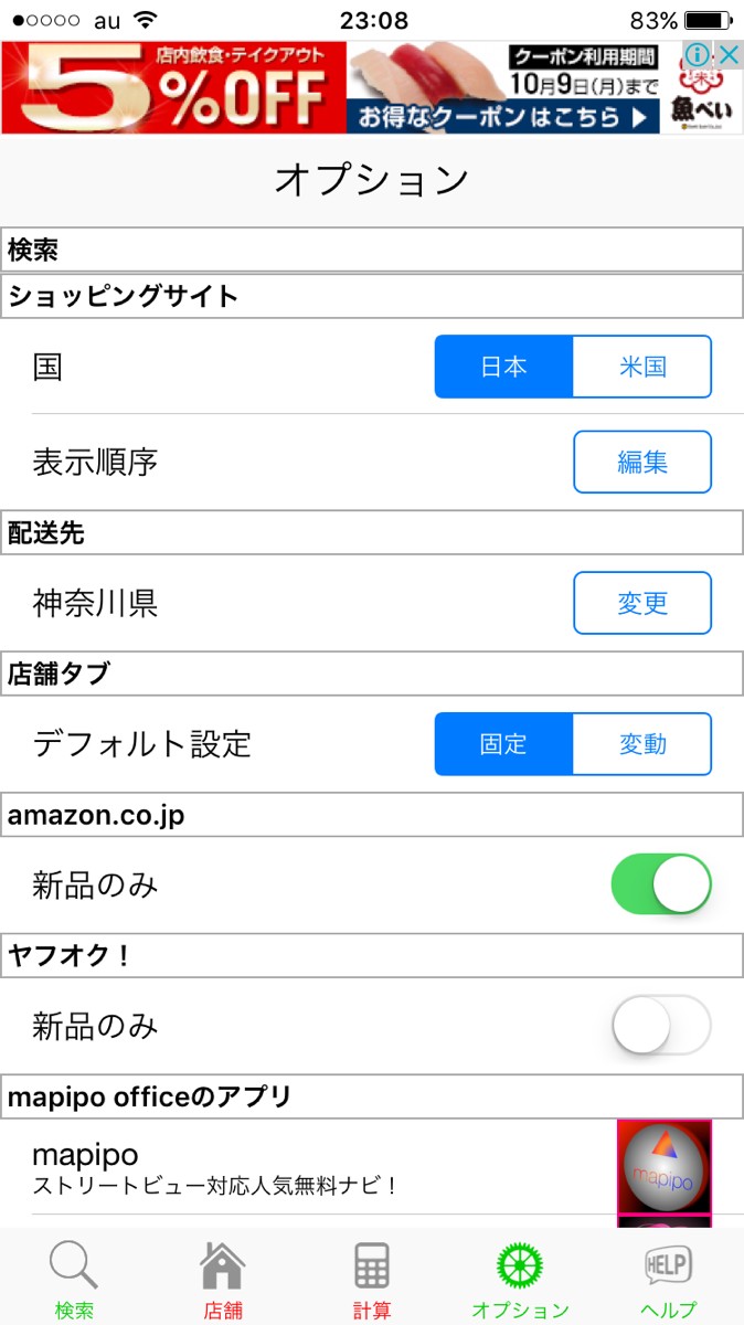 商品の検索は簡単ですが、事前に「オプション」で配送先や利用するネットショップの種類などを設定しておくとより便利にアプリを活用できます。